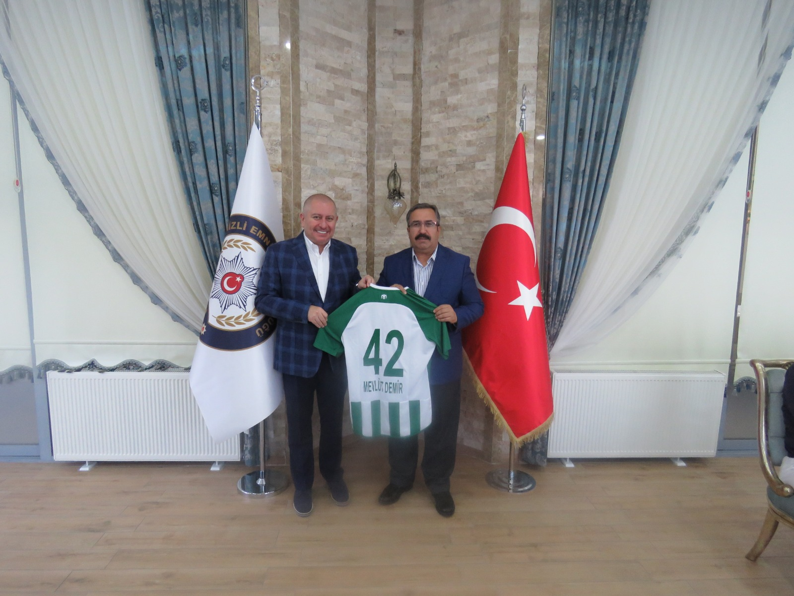 Denizli İl Emniyet Müdürü Mevlüt Demir Denizlispor ile oynadığımız Süper Lig müsabakası öncesi Başkanımız Hilmi Kulluk ve Yönetim Kurulu Üyelerimizi Polisevi’nde ağırladı. Başkanımız Hilmi Kulluk daha önce Konya’da da görev yapan Denizli Emniyet Müdürü Mevlüt Demir’e üzerinde isminin olduğu 42 numaralı forma, çift başlı kartal heykeli figürü ve stadyumumuzun maketini takdim etti. Denizli Emniyet Müdürü Mevlüt Demir ise Başkanımız Hilmi Kullak’a yörük ağa kıyafeti ile Denizli’nin dokuma ve tekstil ürünlerinden hediye etti.