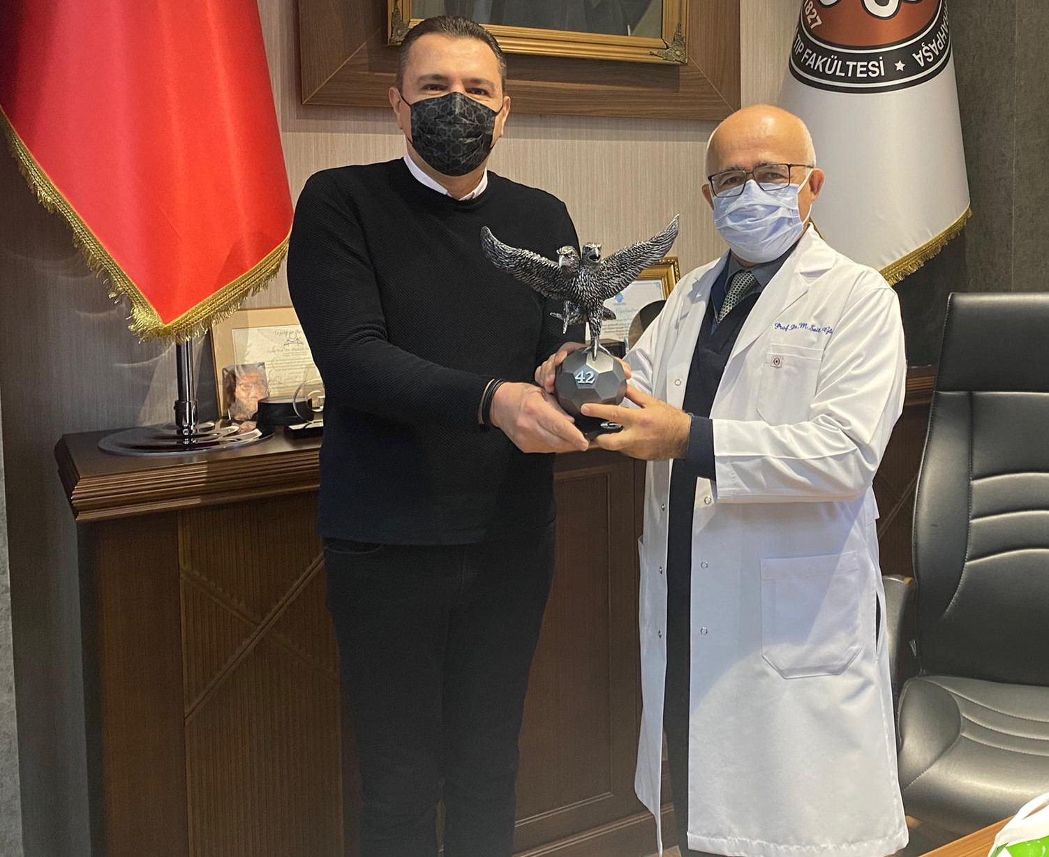 Genel Sekreterimiz Güven Öten, Konyaspor’umuzun eski başkanlarından, İstanbul Üniversitesi Cerrahpaşa Tıp Fakültesi Dekanı Prof. Dr. Sait Gönen’i makamında ziyaret etti. İttifak Holding Konyaspor’umuzun dünü, bugünü ve geleceğiyle ilgili değerlendirmelerin yapıldığı ziyarette Prof.Dr. sait Gönen, “ Şu an Konya’dan uzakta da olsak kalbimiz Konyaspor’la atıyor. Kazandığı hafta mutlu oluyoruz. Kaybettiğimizde haliyle üzülüyoruz. Ama bu sezon sakat oyuncuların eksikliğine rağmen takımımızın başarılı bir ivme yakaladığını görüyorum. İnşallah sezonun kalan kısmında çok daha güzel sonuçlar alacağız ve ligi üst sıralarda tamamlayacağız. Bu vesileyle Sayın Başkan Hilmi Kulluk Bey’e, yönetim kurulu üyelerine, teknik heyete ve futbolcularımıza başarılar diliyorum. Konyaspor’u her zaman yanında olduğumuzu bir kez daha ifade etmek istiyorum ”dedi. Genel Sekreterimiz Güven Öten de ziyarette yaptığı konuşmada, “ Yıllarca Konyaspor’umuza çok değerli hizmetleriniz oldu. Başkanlık yaptınız, dışarıdan desteklediniz. Şimdi İstanbul’daki çalışmalarınız emekleriniz hepimizi gururlandırıyor. İnşallah sizin de ifade ettiğiniz üzere sakatlarımızın takıma dönmesiyle çok daha önemli başarılara imza atacağımıza inancımız sonsuz ” ifadelerini kullandı. Genel Sekreterimiz Güven Öten ziyaretin sonunda Prof. Dr. Sait Gönen’e üzerinde isminin yazılı olduğu 42 numaralı forma ve minyatür çift başlı kartal heykelini hediye etti.