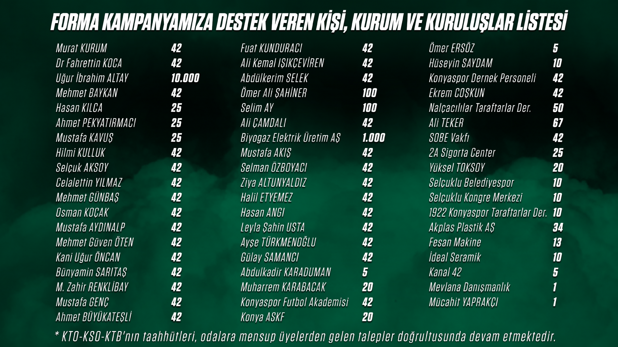 Taraftarlarımızın isteği doğrultusunda başlayan ve Spor Genel Müdürümüz Mehmet Baykan’ın teşviki, Çevre Bakanımız Sayın Murat Kurum ile Sağlık Bakanımız Sayın Fahrettin Koca’nın iştirakleri, Sayın Valimiz Cüneyit Orhan Toprak’ın girişimleri, Büyükşehir Belediye Başkanımız Uğur İbrahim Altay’ın büyük desteği, Başkanımız Hilmi Kulluk ile yönetim kurulu üyelerimizin değerli katkılarıyla gündeme taşınan “ Forma Kampanyası ” için taahhütlerini yerine getiren kişi, kurum ve kuruluşların listesi aşağıdadır. Konyaspor Kulübü olarak; az çok demeden aidiyet hissinin artırılması, Konyasporluluk bilincinin tüm yaş gurupları arasında yaygınlaştırılması ve şehrimizin sokaklarında yeşil beyazlı formalarla dolaşan çocuk, genç, yaşlı, kadın ve erkeklerin çoğalması düşüncesiyle kampanyaya katkı sağlayan herkese teşekkür ederiz. KONYASPOR FORMA KAMPANYASI SIRA İSİM UNVAN - FİRMA DESTEK ADETİ TESLİM DURUMU 1 Murat KURUM Çevre ve Şehircilik Bakanı 42 Teslim Edildi 2 Dr Fahrettin KOCA Sağlık Bakanı 42 Teslim Edildi 3 Uğur İbrahim ALTAY Konya Büyükşehir Belediye Başkanı 10.000 Teslim Edildi 4 Mehmet BAYKAN Spor Genel Müdürü 42 Teslim Edildi 5 Hasan KILCA Karatay Belediye Başkanı 25 Bu Hafta Teslim Edilecek 6 Mustafa KAVUŞ Meram Belediye Başkanı 25 Teslim Edildi 7 Ahmet PEKYATIRMACI Selçuklu Belediye Başkanı 25 Teslim Edildi 8 Hilmi KULLUK Konyaspor Başkanı 42 Teslim Edildi 9 Selçuk AKSOY Konyaspor II. Başkanı 42 Teslim Edildi 10 Celalettin YILMAZ Konyaspor Başkan Vekili 42 Teslim Edildi 11 Mehmet GÜNBAŞ Konyaspor Genel Sekreter 42 Teslim Edildi 12 Osman KOÇAK Konyaspor Başkan Yardımcısı 42 Teslim Edildi 13 Mustafa AYDINALP Konyaspor Başkan Yardımcısı 42 Teslim Edildi 14 Mehmet Güven ÖTEN Konyaspor Basın Sözcüsü 42 Teslim Edildi 15 Kani Uğur ÖNCAN Konyaspor Genel Sayman 42 Teslim Edildi 16 Bünyamin SARITAŞ Konyaspor AS Başkan 42 Teslim Edildi 17 M. Zahir RENKLİBAY Konyaspor AS Başkan 42 Teslim Edildi 18 Mustafa GENÇ Konyaspor AS Başkan 42 Teslim Edildi 19 Ahmet BÜYÜKATEŞLİ Konyaspor AS Başkan 42 Teslim Edildi 20 Fuat KUNDURACI Konyaspor Yön. Krl. Üyesi 42 Teslim Edildi 21 Ali Kemal IŞIKÇEVİREN Konyaspor Yön. Krl. Üyesi 42 Teslim Edildi 22 Abdülkerim SELEK Konyaspor Yön. Krl. Üyesi 42 Teslim Edildi 23 Ömer Ali ŞAHİNER Konyaspor Futbolcu 100 Teslim Edildi 24 Selim AY Konyaspor Futbolcu 100 Teslim Edildi 25 Ali Çamdalı Konyaspor Futbolcu 42 Teslim Edildi 26 Ali Şahinbey Konya Biyogaz Elektrik Üretim AŞ 1000 Teslim Edildi 27 Mustafa AKIŞ Cumhurbaşkanı Başdanışmanı 42 Teslim Edildi 28 Selman ÖZBOYACI AK Parti Konya Milletvekili 42 Teslim Edildi 29 Ziya ALTUNYALDIZ AK Parti Konya Milletvekili 42 Teslim Edildi 30 Halil ETYEMEZ AK Parti Konya Milletvekili 42 Teslim Edildi 31 Leyla Şahin USTA AK Parti Genel Başkan Yardımcısı 42 Teslim Edildi 32 Ayşe TÜRKMENOĞLU Cumhurbaşkanı Başdanışmanı 42 Teslim Edildi 33 Gülay SAMANCI AK Parti Konya Milletvekili 42 Teslim Edildi 34 Hasan ANGI AK Parti İl Başkanı 42 Teslim Edildi 35 Abdulkadir KARADUMAN Saadet Partisi Konya Milletvekili 5 Teslim Edildi 36 Muharrem KARABACAK KONESOB Başkanı 20 Teslim Edildi 37 Konyaspor Futbol Akademisi Konyaspor Futbol Akademisi 42 Teslim Edildi 38 Remzi AY Konya ASKF 20 Teslim Edildi 39 Ömer ERSÖZ Gençlik Spor İl Müdürü 5 Teslim Edildi 40 Hüseyin SAYDAM Saadet Partisi İl Başkanı 10 Teslim Edildi 41 Konyaspor Kulübü Konyaspor Dernek Personel 42 Teslim Edildi 42 Ekrem Çoşkun Ekrem Çoskun Döner 42 Teslim Edildi 43 Nalçacılılar Taraftarlar Derneği Nalçacılılar Taraftarlar Derneği 50 Teslim Edildi 44 Ali TEKER Kimsev 67 Teslim Edildi 45 SOBE Selçuklu Otizmli Bireyler Eğitim Vakfı 42 Teslim Edildi 46 Osman Öztürk 2A Sigorta Center 25 Teslim Edildi 47 Yüksel TOKSOY Yüksel Toksoy 20 Teslim Edildi 48 Selçuklu Belediyespor Selçuklu Belediyespor 10 Teslim Edildi 49 Recep ALTINOK Selçuklu Kongre Merkezi 10 Teslim Edildi 50 1922 Konyaspor Taraftarlar Derneği 1922 Konyaspor Taraftarlar Derneği 10 Teslim Edildi 51 Recep Elmastaş Akplas Plastik AŞ 34 Teslim Edildi 52 Selim Selvi Fesan Makine 13 Teslim Edildi 53 İdeal Seramik İdeal Seramik Sıhhi Tesisat Malz. San. ve Tic AŞ 10 Teslim Edildi 54 Kanal 42 Kanal 42 5 Teslim Edildi 55 Mevlana Danışmanlık Mevlana Danışmanlık 1 Teslim Edildi 56 Mücahit YAPRAKÇI Mücahit YAPRAKÇI 1 Teslim Edildi 57 Mustafa AK Mustafa AK 8 Teslim Edildi TOPLAM 12901 * KTO-KSO-KTB'nın taahhütleri, odalara mensup üyelerden gelen talepler doğrultusunda devam etmektedir.