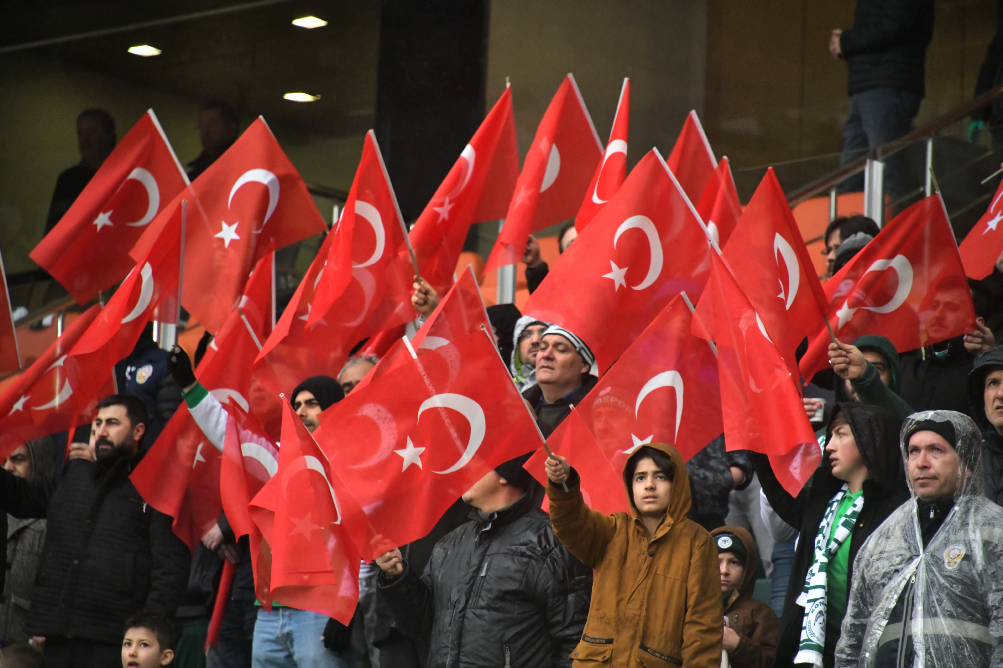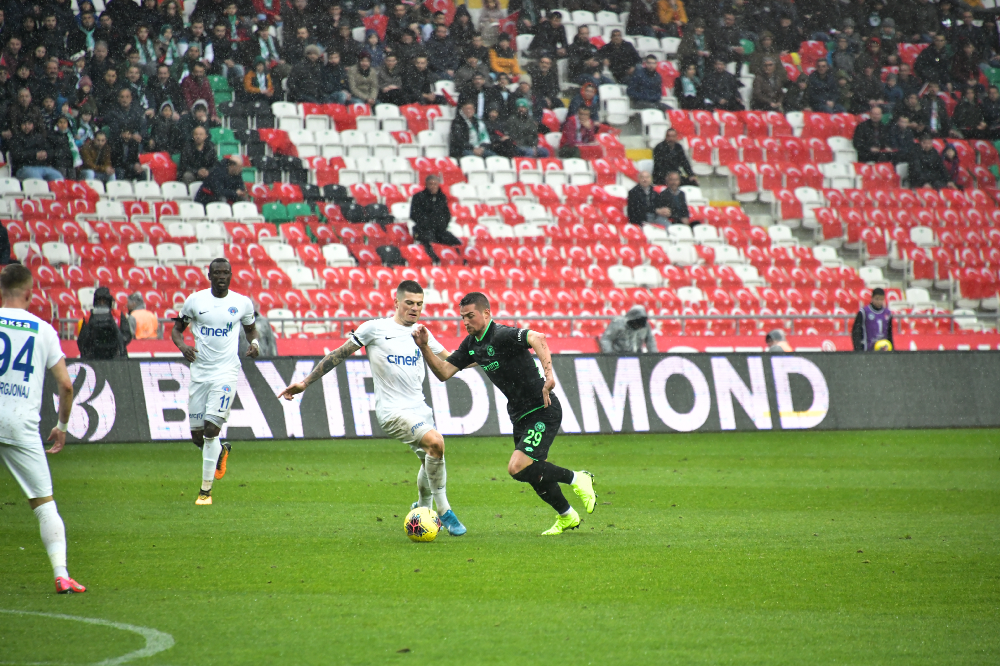 Süper Lig’de 2019-2020 Cemil Usta Sezonu 24.hafta maçında Kasımpaşa’yı konuk eden İttifak Holding Konyaspor’umuz, gol atamadığı maçtan 0-0’lık beraberlikle ve 1 puanla ayrıldı. Konya Büyükşehir Belediyesi Stadyumu’nda saat 14:00’da başlayan karşılaşma öncesinde maçı izlemeye gelen taraftarlarımıza Türk bayrağı dağıtılırken, İdlib’de gerçekleşen hain saldırıda şehit olan kahraman Mehmetçiklerimizin fotoğrafları ve isimleri ekrana yansıtılıp anons edildi ve tüm taraftarlarımız ‘BURADA’ diyerek anonslara eşlik etti. Maç öncesinde hakemler ve her iki takım oyuncuları ise seremoniye ‘MİLLETİMİZİN BAŞI SAĞOLSUN’ yazılı TFF’nin pankartı ile çıktı. Karşılaşmanın ilk yarısında Kasımpaşa kalesinde etkili olan takımımız yakaladığı iki fırsatı değerlendiremedi ve ilk yarı başladığı gibi golsüz sona erdi. İkinci yarıya Levan Shengelia’nın yerine Rogerio Thuram’ı alarak başlayan takımımız rakip kalede baskı kurmasına rağmen son paslarda etkili olamadı. Kalan dakikalarda çabalar sonucu değiştirmeye yetmedi ve mücadele 0-0 sona erdi. İttifak Holding Konyaspor’umuz bu sonuçla haftayı 22 puanla tamamladı. STAD: Konya Büyükşehir Belediyesi HAKEMLER: Ali Palabıyık, Serkan Olguncan, Mustafa Sönmez İTTİFAK HOLDİNG KONYASPOR: Serkan, Skubic, Selim Ay, Uğur Demirok, Guilherme, Jens Jonsson, Amir Hadziahmetovic, Ömer Ali Şahiner (Dk.75 Paolo Hurtado), Robert Mak (Dk.65 Riad Bajic), Levan Shengelia (Dk.46 Rogerio Thuram), Deni Milosevic YEDEKLER: Ertuğrul, Ali Turan, Marin Anicic, Volkan fındıklı, Alper Uludağ, Ferhat Öztorun, Marko Jevtovic TEKNİK SORUMLU: Bülent Korkmaz KASIMPAŞA: Ramazan, Hadergjonaj, Meriah, Brecka (Dk.13 Jorge Fernandes), Haddadi, Tirpan, Aytaç Kara, Hajradinovic, Quaresma (Dk.76 Yusuf Erdoğan), Thiam, Koita (dk.59 Ndongala) YEDEKLER: Murat Can, Berk, D.Haspolat, Tarkan Serbest, İlhan Depe, Anıl Koç, Gohou TEKNİK SORUMLU: Fuat Çapa SARI KART: Paolo Hurtado (İttifak Holding Konyaspor) GOL: Yok