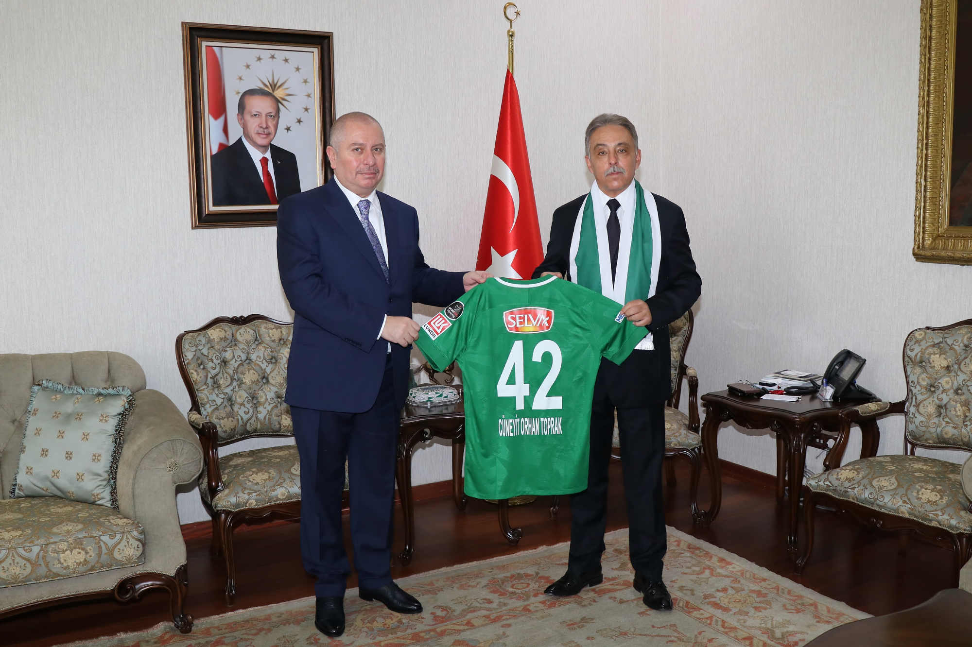 Başkanımız Hilmi Kulluk ve İkinci Başkanımız Selçuk Aksoy Valimiz Cüneyit Orhan Toprak'ı makamında ziyaret etti. Olağanüstü Genel Kurul öncesi bir yıllık icraatlar ve mali tabloyla ilgili Vali Cüneyit Orhan Toprak'ı bilgilendiren Başkanımız Hilmi Kulluk, sezon içinde birçok maça gelerek takımımıza verdiği destekten ötürü kendilerine teşekkür etti. Vali Cüneyit Orhan Toprak ise ziyarette yaptığı konuşmada mevcut yönetimi Konyaspor'a hizmetleri nedeniyle tebrik ve takdir ettiğini ifade ederek genel kurulun camiaya hayırlar getirmesi temennisinde bulundu. Ziyaretin ardından Başkanımız Hilmi Kulluk Valimize üzerinde isminin yazılı olduğu 42 numaralı forma ile çift başlı kartal heykelimizin minyatürünü hediye etti.
