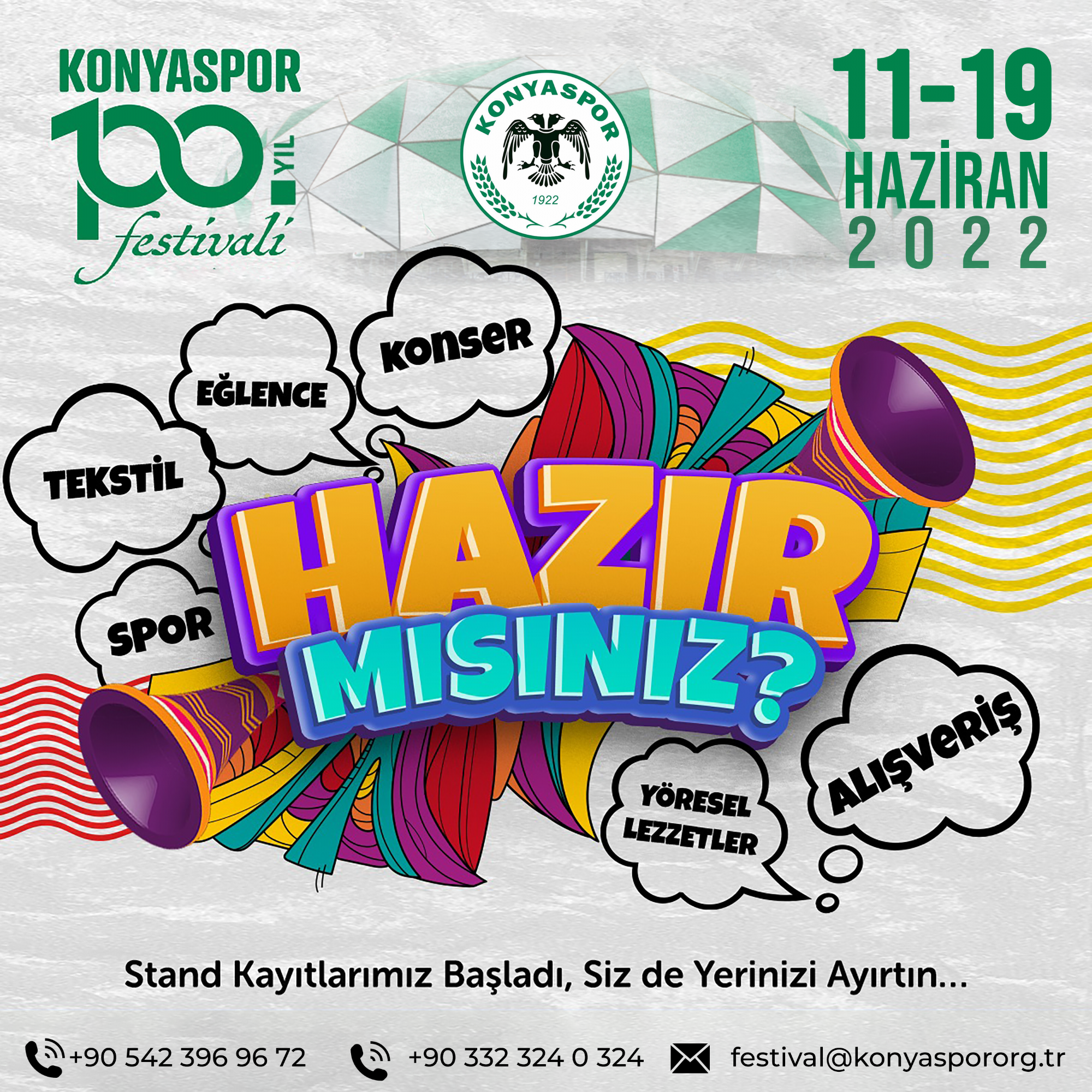 100 Yıllık Çınar Konyaspor’umuzun 100. yılına özel düzenleyeceği festival, 11-19 Haziran 2022 tarihlerinde yapılacak. Mart ayında gerçekleştirdiğimiz Gala Gecesi ile 100. yıl etkinliklerine start veren kulübümüz, 9 gün sürecek festivalin hazırlıklarına tüm hızıyla devam ediyor. Stadyum içerisi ve dışarıdaki etkinlik alanında düzenlenecek konserlerle renklenecek 100. Yıl Festivali'nin açılış ve kapanışında ışık ve lazer şovlarla mapping gösterimleri olacak ve katılımcılar unutulmaz anlar yaşayacak. Festival alanında yer alacak onlarca alışveriş ve gıda stantı lunapark ve panayır alanları ile tüm zamanınızı eğlenerek değerlendirebileceksiniz. Stadyum içi konserler biletli, festival alanı konserleri ise halka açık olacak. Stant kiralamak isteyenlerin 0542 396 96 72 / 0332 324 0 324 numarasını aramaları önemle rica olunur. Yaklaşık 2 milyon ziyaretçi ağırlamayı hedeflediğimiz festival programımızın detayları şu şekildedir: 10.00 Festival Stant Alanı Açılış 16.30 -18.30 Festival Alanı Halk Konserleri 19.30 Stadyum girişi görsel şovlar ve stadyum içerisi konserler FESTİVAL KONSERLERİ 11 Haziran Demet Akalın - Soner Sarıkabadayı - Ece Seçkin 12 Haziran Linet - Cengiz Kurtoğlu - Ahmet Şafak 13 Haziran Göksel - Manga - Eypio 14 Haziran Burcu Güneş - Serdar Ortaç - Kutsi 15 Haziran Teoman - Mehmet Erdem - Çağatay Akman 16 Haziran Ziynet Sali - Hakan Altun - Gökcan Sanliman 17 Haziran Funda Arar - Kubat - Resul Dindar 18 Haziran Gülben Ergen - Ferhat Göçer - Gripin 19 Haziran Haluk Levent - Ceza - Aydilge