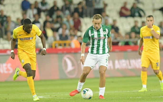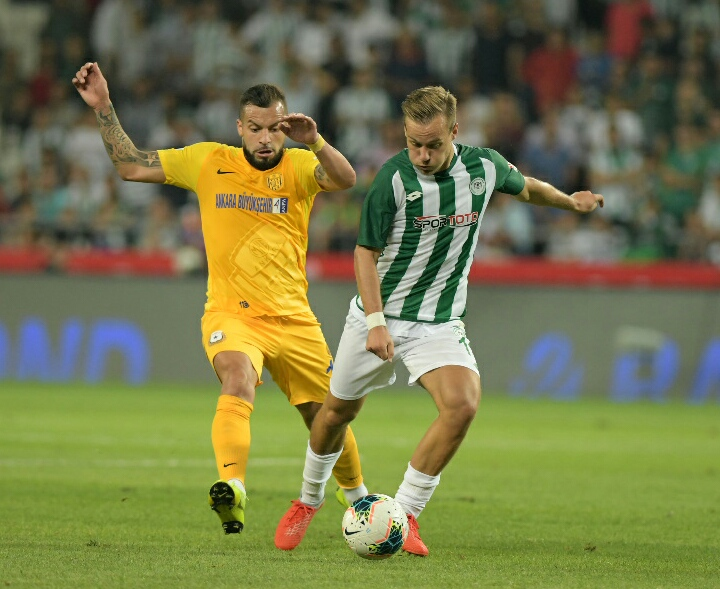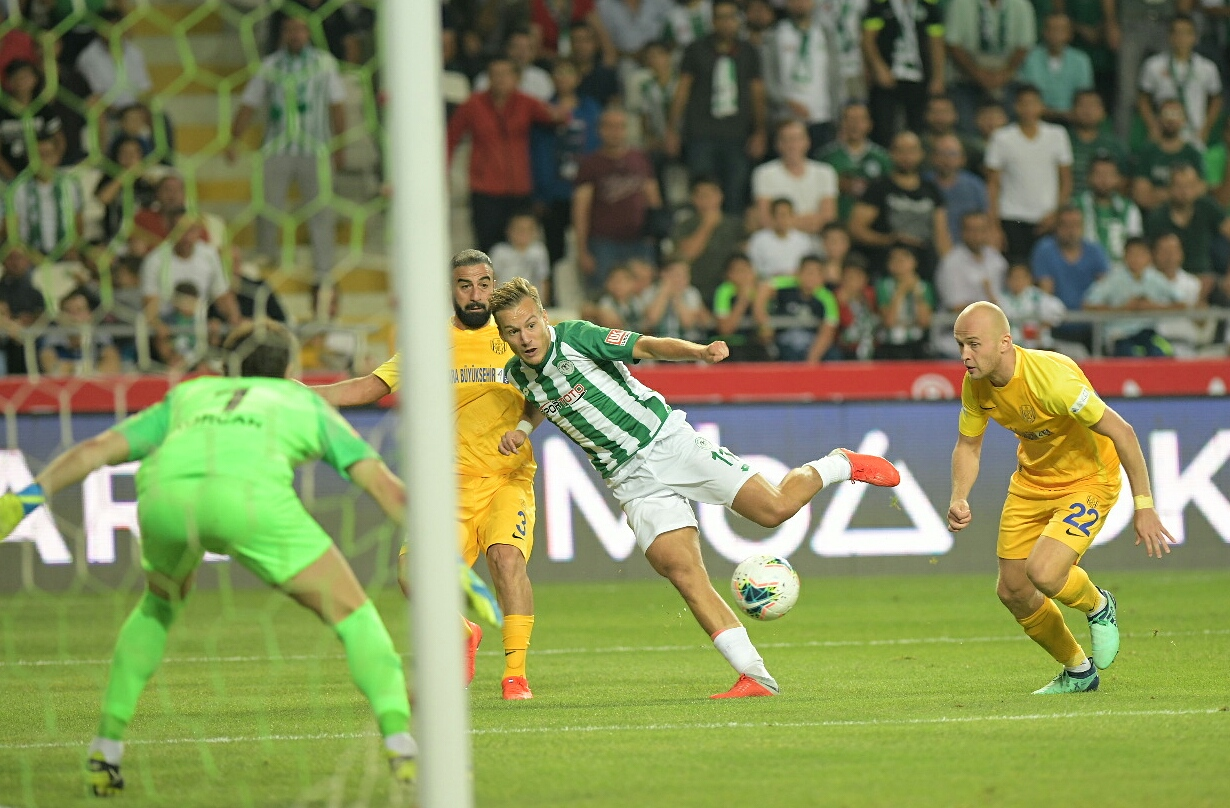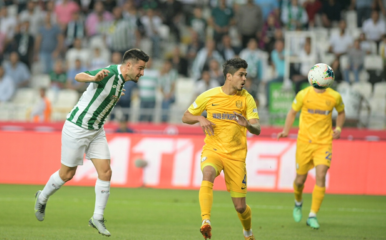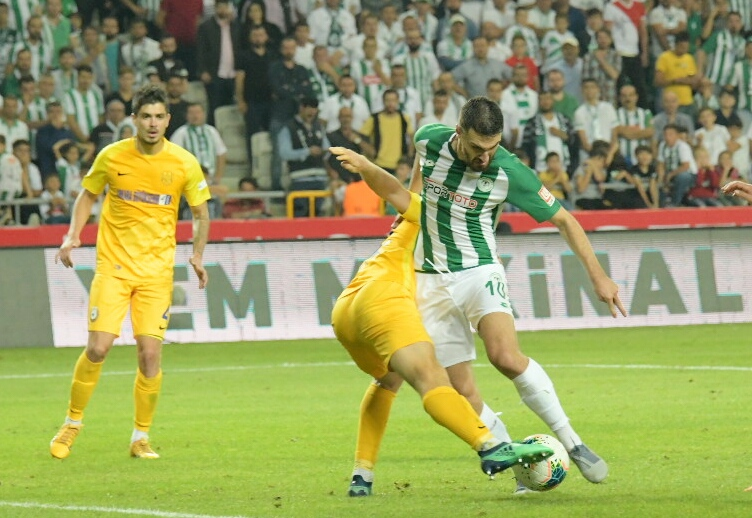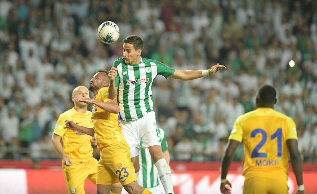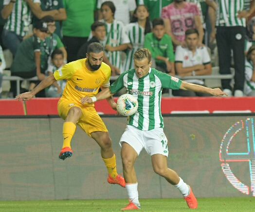 Süper Lig 2019-2020 Cemil Usta Sezonu 1.hafta maçında MKE Ankaragücü’nü konuk eden takımımız, bir topunun direkten döndüğü ve çok sayıda fırsat yakaladığı ama değerlendiremediği mücadeleden 0-0’lık beraberlikle ayrıldı. Konya Büyükşehir Belediyesi Stadyumu’nda saat 19:15’de başlayan karşılaşmayı yaklaşık 25 bin taraftarımız takip ederken, her iki takımda sahaya AFAD’ın ‘Afetlere Hazır Ol’ yazılı pankartlarıyla çıktı. Mücadelenin ilk yarısında rakip kalede daha etkili olan takımımızda 15.dakikada Ömer Ali Şahiner’in kafa vuruşu direkten oyun alanına dönerken, Riad Bajic ve Nejc Skubic ile yakalanan fırsatlar golle sonuçlanmayınca ilk yarı başladığı gibi golsüz sona erdi. Etkili oyununu ikinci yarıda da sürdüren Konyaspor’umuzda Deni Milosevic’in iki, Mücahit Can Akçay’ın bir şutunda kaleci Korcan gole izin vermezken, takımımız Riad Bajic, Erdon Daci ile girdiği pozisyonlarda sonuca gidemedi. Gol sesi çıkmayan mücadele 0-0 berabere sona erdi ve Konyaspor’umuz, Süper Lig 2019-2020 Cemil Usta Sezonu’na 1 puanla başlangıç yaptı. STAD: Konya Büyükşehir Belediyesi HAKEMLER: Bülent Birincioğlu, Mehmet Metin, Mehmet Kısal KONYASPOR: Serkan Kırıntılı, Nejc Skubic, Ali Turan, Marin Anicic, Ferhat Öztorun (Dk.73 Mücahit Can Akçay), Marko Jevtovic, Jens jonsson, Ömer Ali Şahiner, Erdon Daci, Deni Milosevic (Dk.79 Ali Yaşar), Riad Bajic YEDEKLER: Ertuğrul, Mücahit Atalay, Selim Ay, Ali Çamdalı, Alper Uludağ, Ali Karakaya, Yevhen Opanasenko, Petar Filipovic TEKNİK SORUMLU: Aykut Kocaman MKE ANKARAGÜCÜ: Korcan, Kıtsıou, Kulusic, Pazdan, Mehmet Sak (Dk.87 Cebrail), Moke (Dk.86 Fathy), Canteros, Aydın Karabulut (Dk.77 Sadaev), İlhan Parlak, Orgıll YEDEKLER: Furkan, Yalçın Ayhan, Alihan, Pinto, Ender, Ahmet Can, Hasan Kaya TEKNİK SORUMLU: Adnan Erkan SARI KARTLAR: İlhan Parlak, Ricardo Fathy (MKE Ankaragücü) GOL: Yok