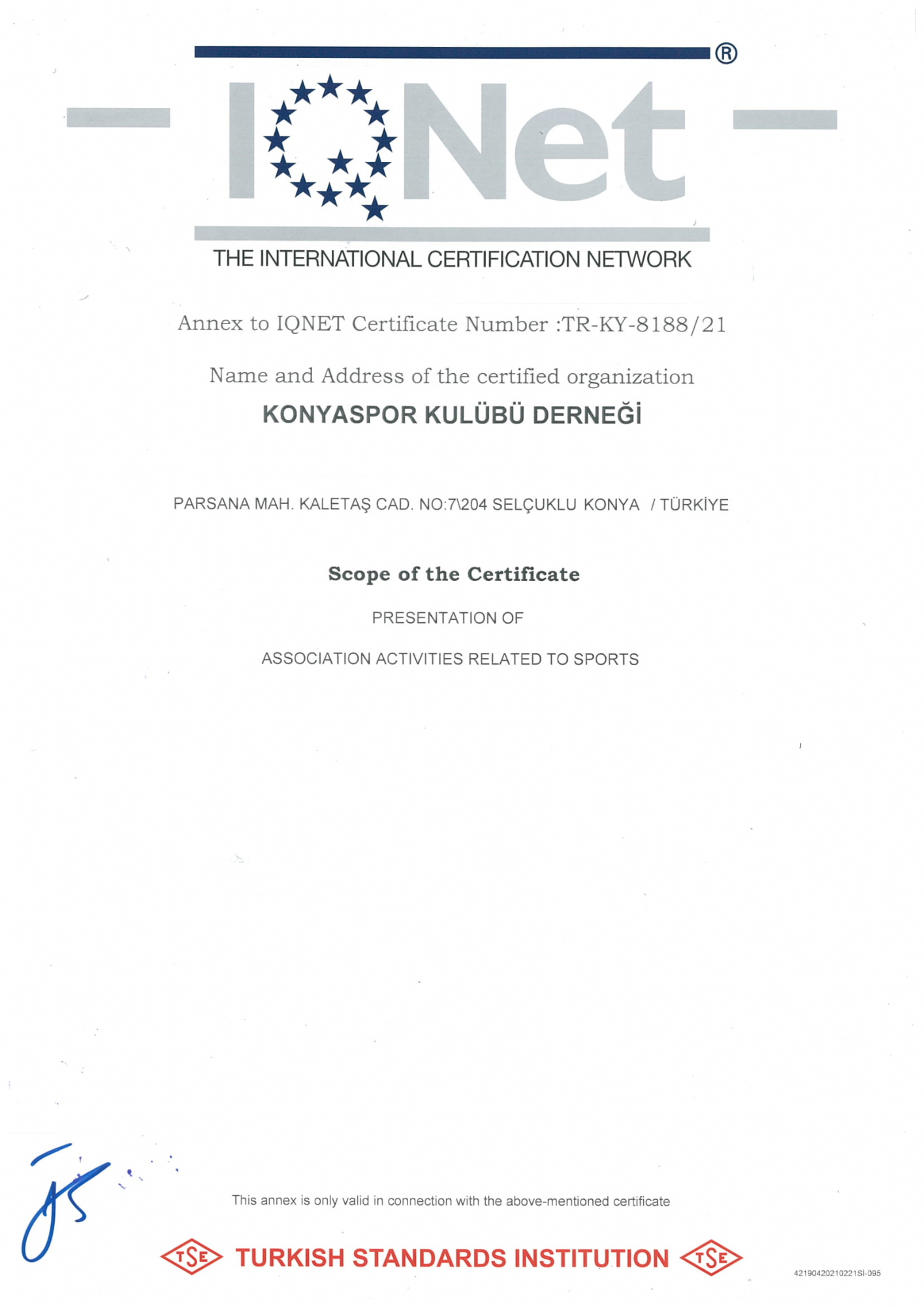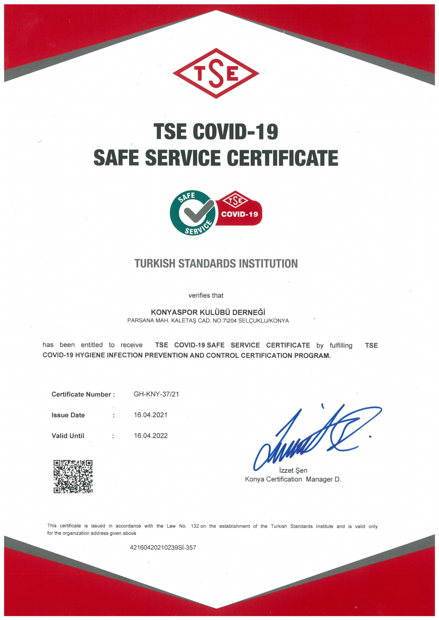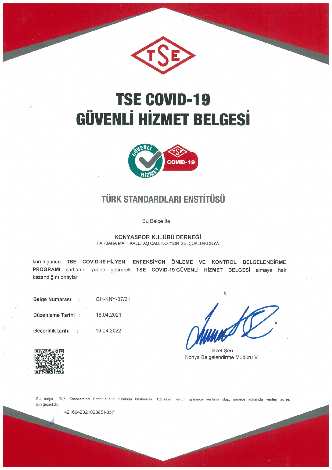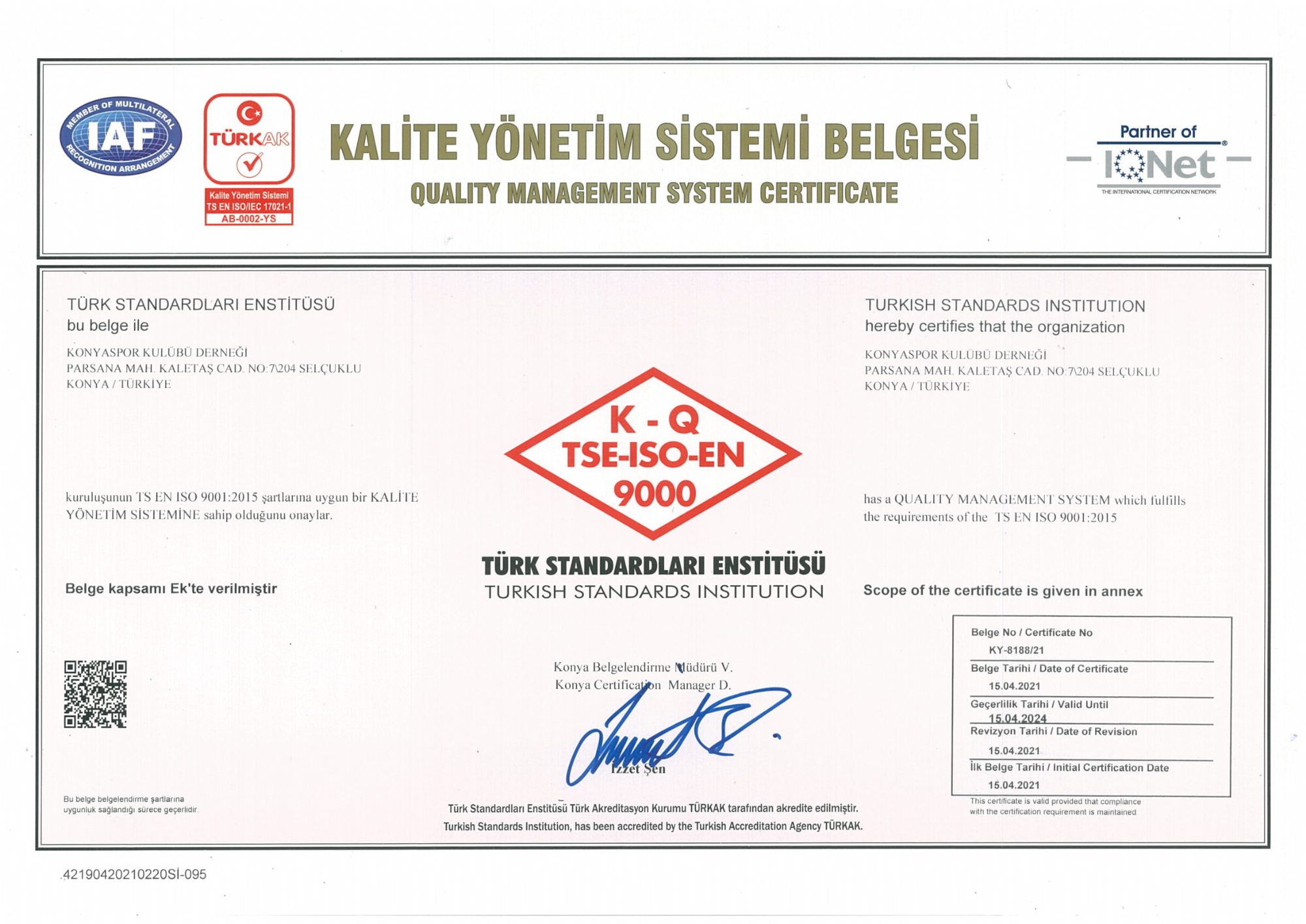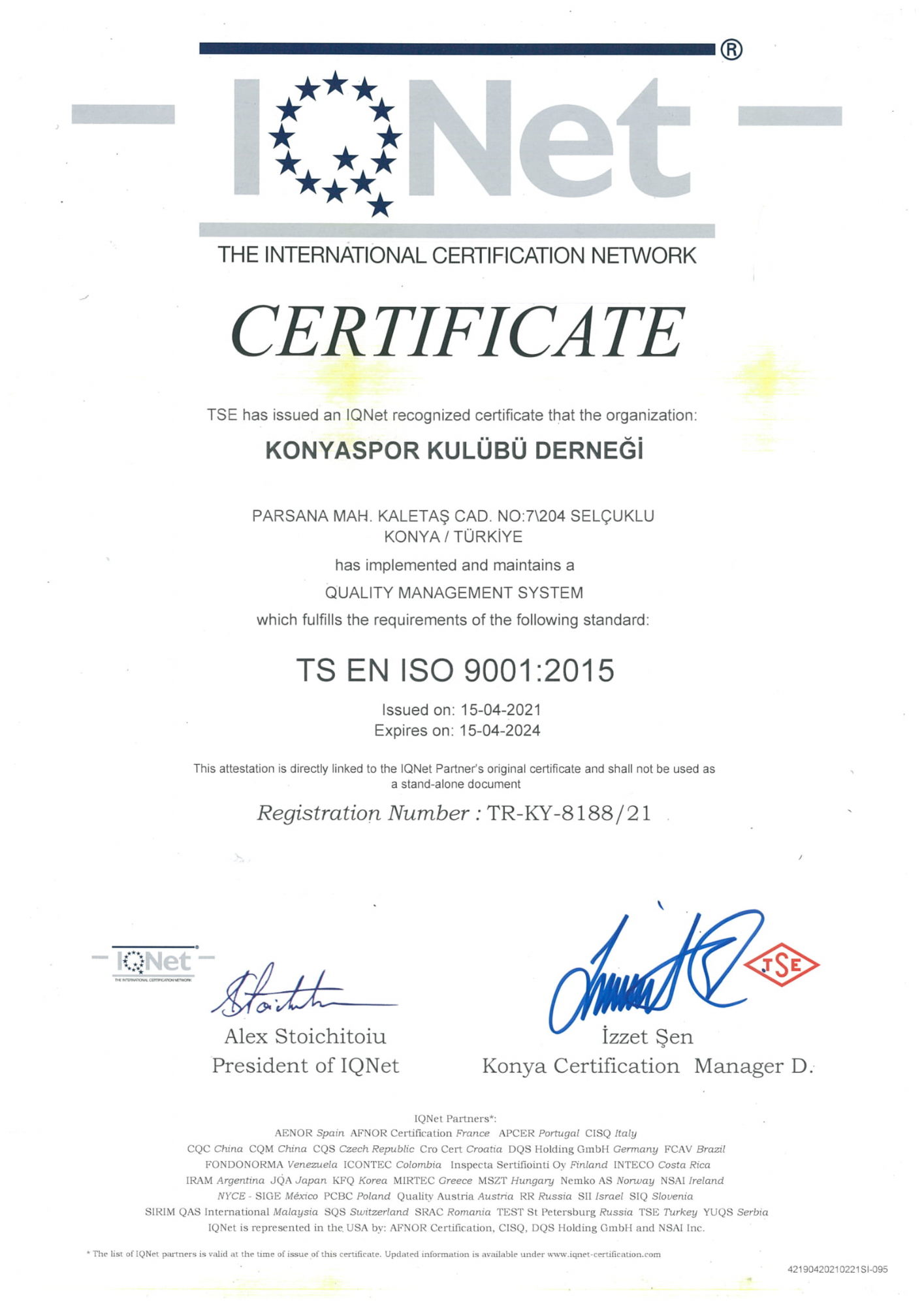İttifak Holding Konyaspor’umuz, kalite yolculuğunda ilk adımını ISO 9001:2015 Kalite Yönetim Sistemi (KYS) sertifikasını alarak attı. Türk Standartları Enstitüsü tarafından yapılan ve 13 Nisan 2021 tarihindeki son denetimi de başarıyla tamamlayan kulübümüz, ‘TS EN ISO 9001:2015 Kalite Yönetim Sistemi’ belgesi almaya hak kazandı. ‘TS EN ISO 9001:2015 Kalite Yönetim Sistemi’ belgesine sahip olan az sayıda Süper Lig takımlarının arasında artık kulübümüz de bulunuyor. Özel şirketler yerine Türk Standartları Enstitüsü tarafından denetlenmeyi tercih eden kulübümüz, Kalite Yönetim Sistemi Belgesi’nin yanı sıra Güvenli Hizmet Belgesinin de sahibi oldu. Kulübümüze verilen ISO 9001:2015 KYS sertifikası her yıl mutat olarak yapılacak denetimlerin ardından 3 yıl sonra revize edilebilecek.