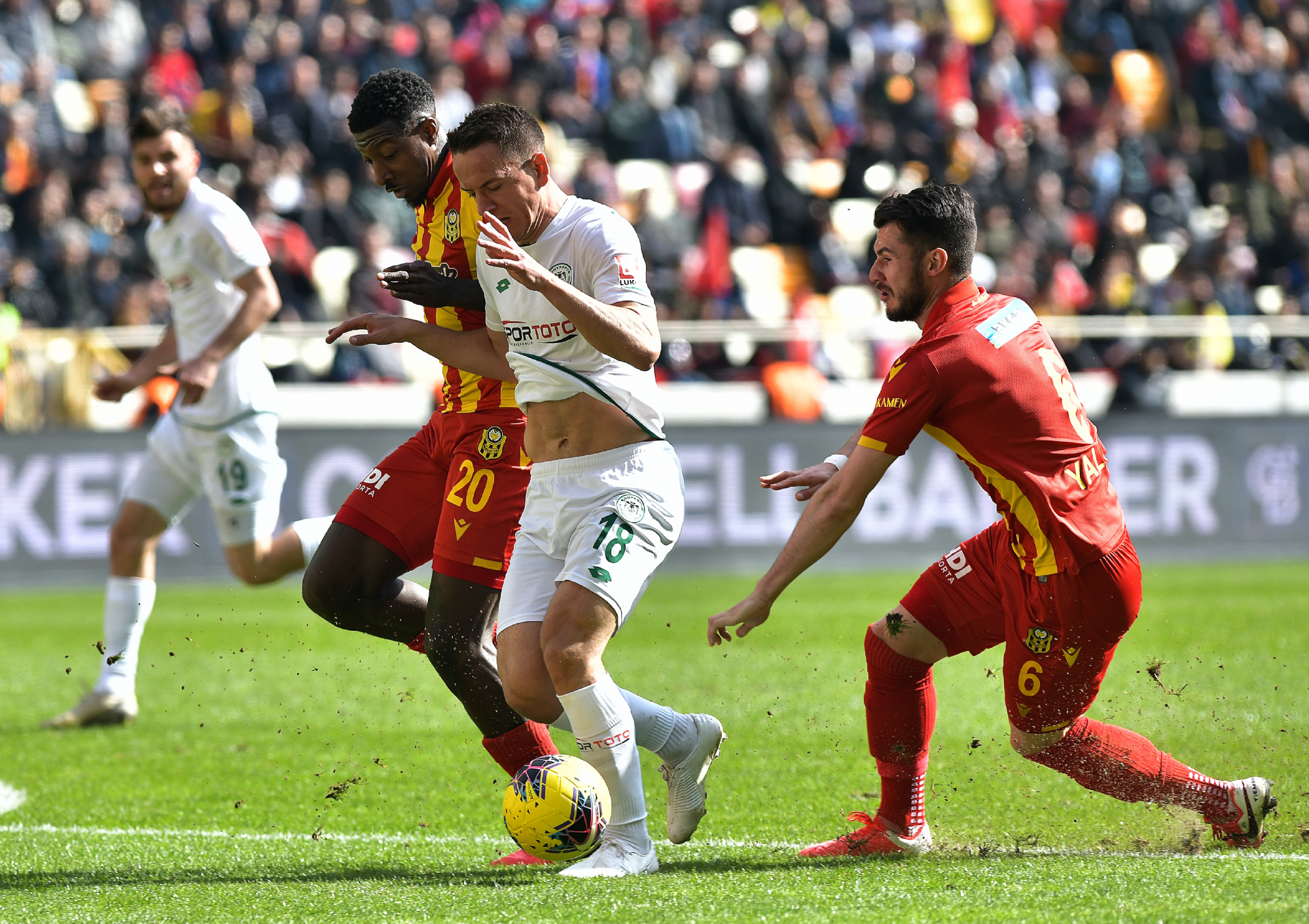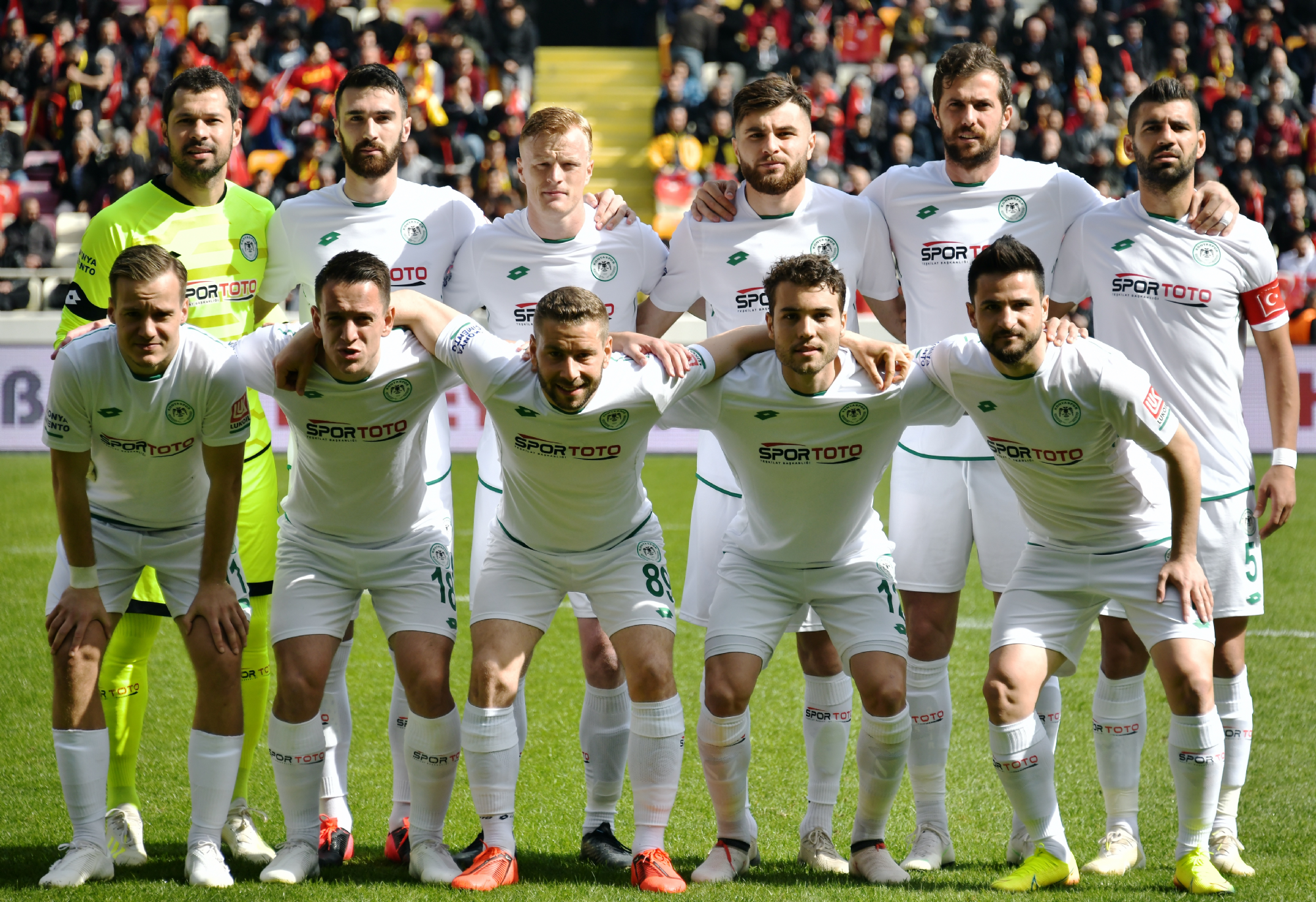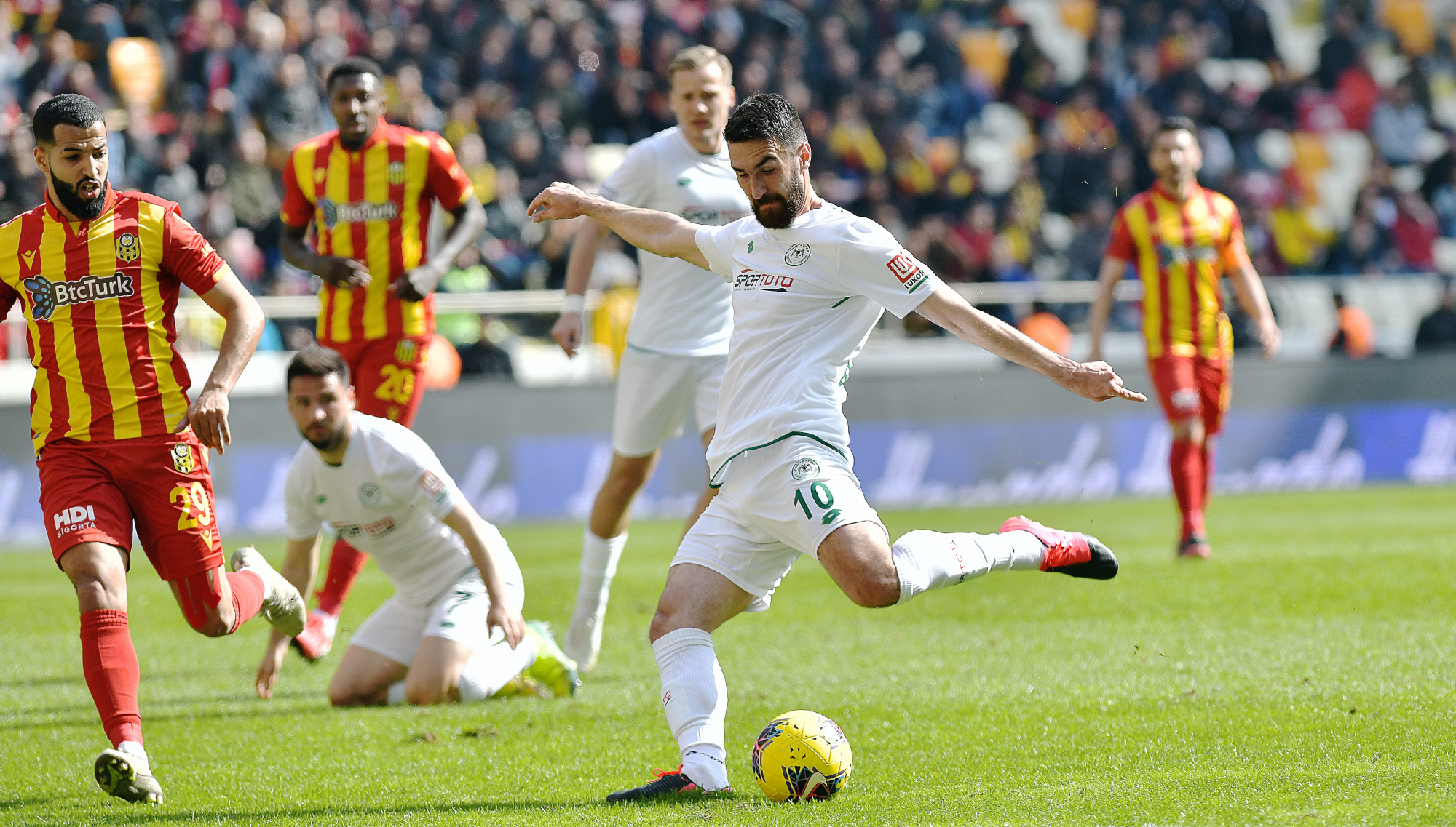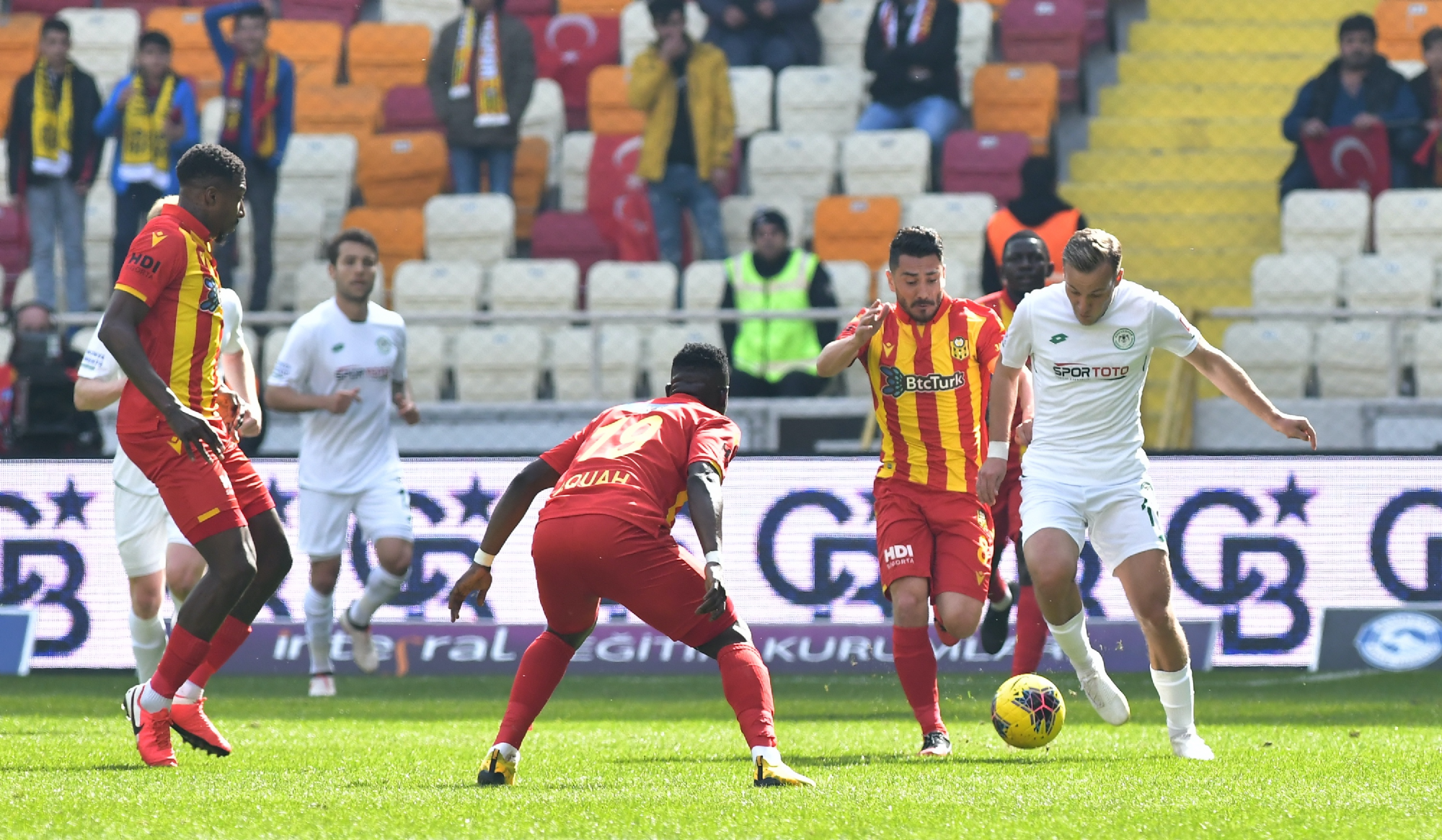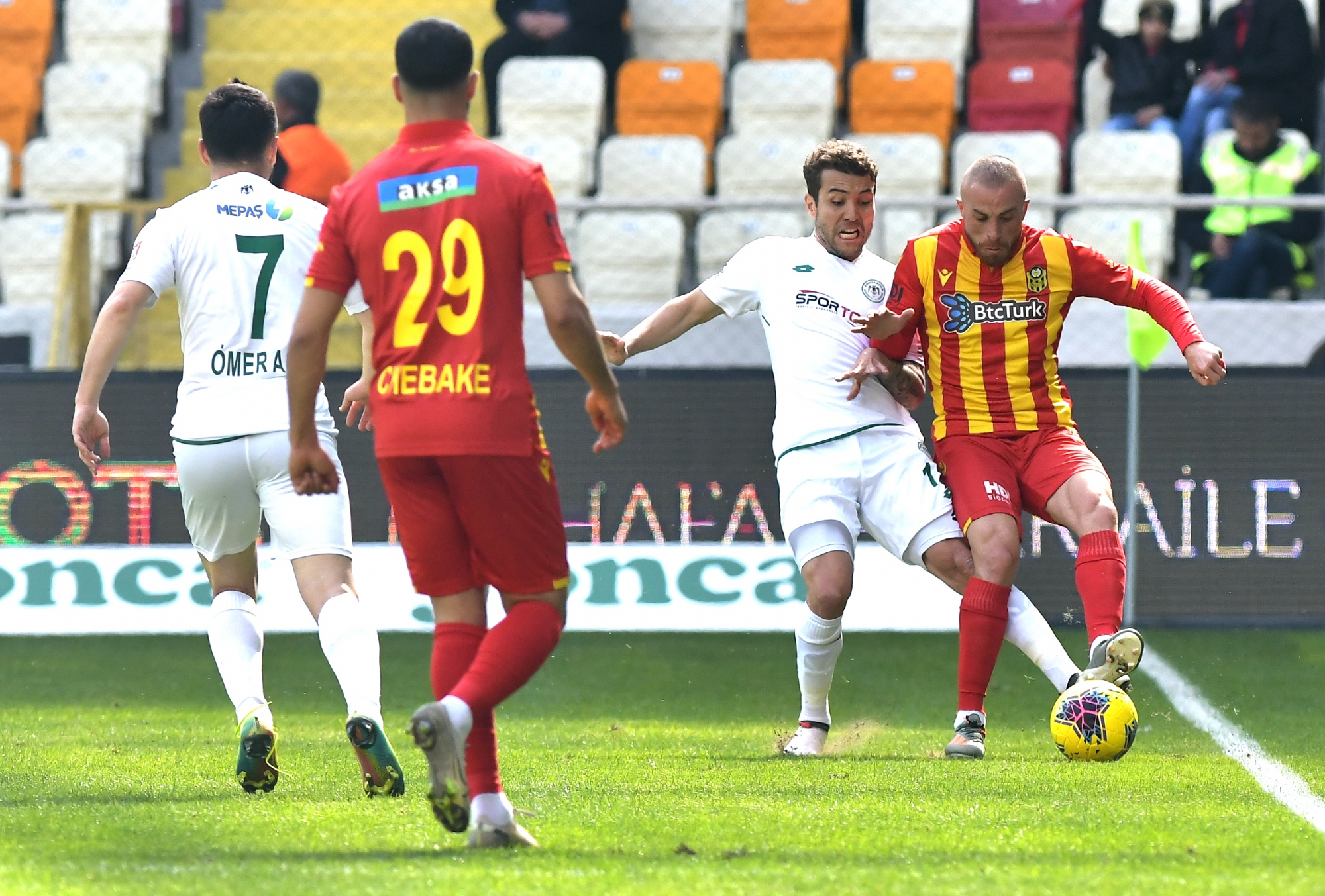 Süper Lig’de 25.hafta maçında deplasmanda BtcTurk Y.Malatyaspor ile karşılaşan İttifak Holding Konyaspor’umuz, ilk yarısını 1-0 önde tamamladığı mücadeleden 1-1’lik skorla ayrıldı. Yeni Malatya Stadyumu’nda saat 14:00’da başlayan karşılaşmaya istekli başlayan takımımız Riad Bajic ve Amir Hadziahmetovic ile yakaladığı fırsatlarda kaleci Farnolle’yi geçemezken, 45+2.dakikada Riad Bajic ceza sahası içerisinde yerde kaldı. Hakem Cüneyt Çakır Chebake’yi kırmızı kartla oyun dışına gönderirken, kazanılan penaltıyı Riad Bajic gole çevirdi ve takımımız ilk yarıyı 1-0 önde tamamladı. 10 kişi kalan rakibi karşısında ikinci yarı yine fırsatlar bulan takımımız 80.dakikada Murat Yıldırım’ın golüne engel olamadı ve skora 1-1 ile denge geldi. 88.dakikada ceza sahası dışında topu elle oynayan kalecimiz Serkan Kırıntılı kırmızı kart ile oyun dışı kaldı. Her iki takımında 10 kişi tamamladığı mücadele 1-1 sona erdi. STAD: Yeni Malatya HAKEMLER: Cüneyt Çakır, Bahattin Duran, Tarık Ongun BTCTURK Y.MALATYASPOR: Farnolle, Chebake, Mustafa Akbaş, Robin Yalçın, Karim Hafes, Murat Yıldırım, Acquah, Donald (Dk.68 Kjartansson), Gökhan Töre, Fofana (Dk.90+2 Chalali), Umut Bulut (Dk.57 Bifouma) YEDEKLER: Ufuk, Erkan Kaş, Yiğithan, Youssuf, Özer, Sakıb TEKNİK SORUMLU: Hikmet Karaman İTTİFAK HOLDİNG KONYASPOR: Serkan Kırıntılı, Nejc Skubic, Selim Ay, Uğur Demirok, Guilherme, Jens Jonsson, Amir Hadziahmetovic, Ömer Ali Şahiner (Dk.90 Ertuğrul Taşkıran), Levan Shengelia (Dk.72 Paolo Hurtado), Deni Milosevic, Riad Bajic (Dk.78 Rogerio Thuram) YEDEKLER: Mücahit Atalay, Volkan, Ali Turan, Marko Jevtovic, Alper Uludağ, Ali Karakaya, Ferhat Öztorun TEKNİK SORUMLU: Bülent Korkmaz KIRMIZI KARTLAR: Chebake (Dk.45+2) (BtcTurk Y.Malatyaspor), Serkan Kırıntılı (Dk.88) (İttifak Holding Konyaspor) SARI KARTLAR: Mustafa Akbaş (BtcTurk Y.Malatyaspor), Levan Shengelia, N.Skubic (İttifak Holding Konyaspor) GOLLER: Riad Bajic (Dk.45+3) (İttifak Holding Konyaspor), Murat Yıldırım (Dk.80) (BtcTurk Y.Malatyaspor)