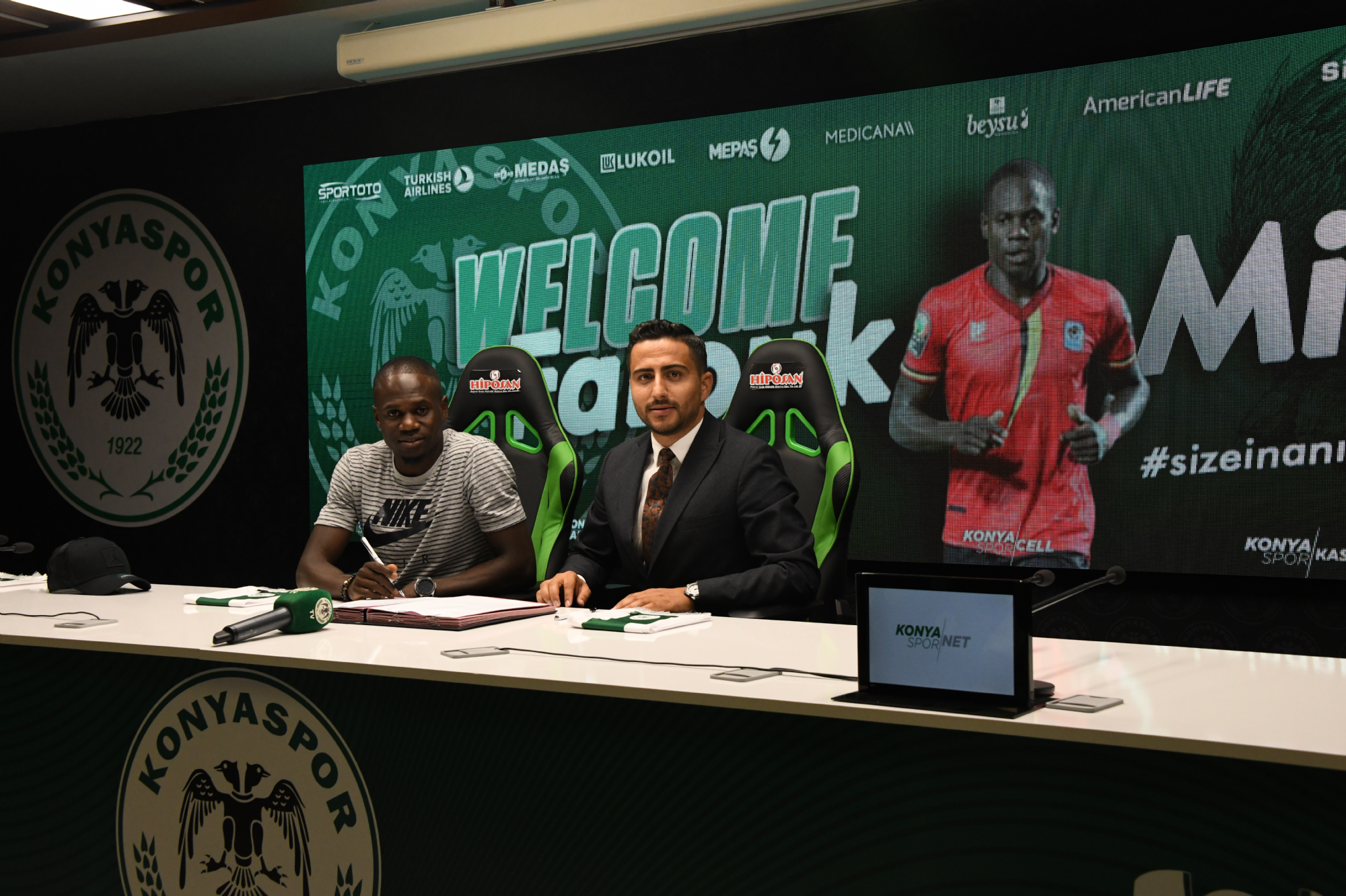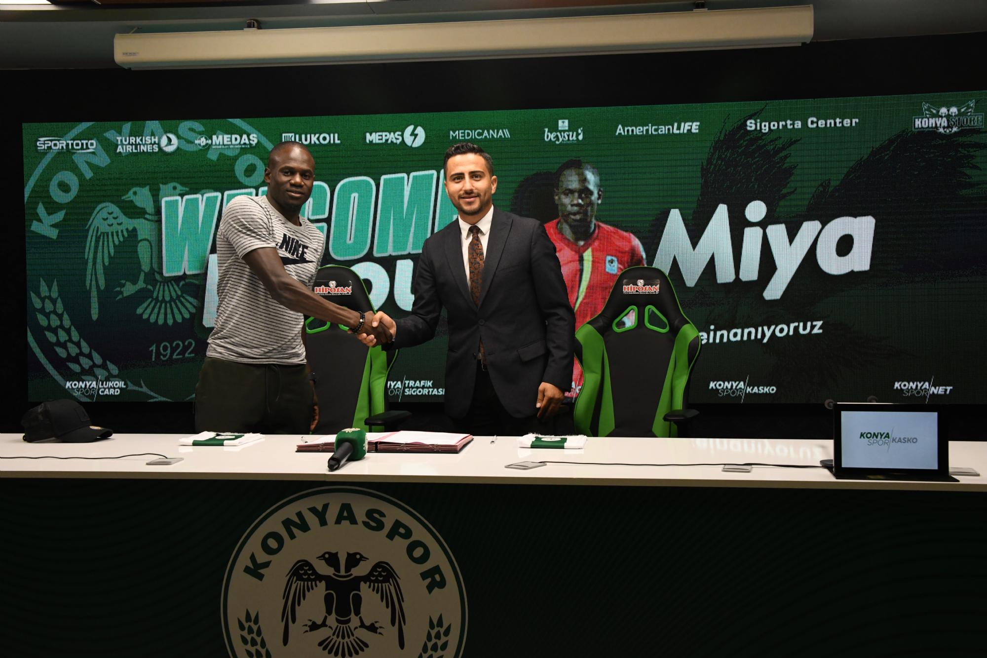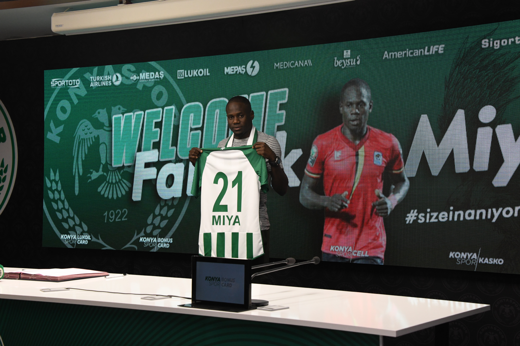 Transfer çalışmalarına devam eden Konyaspor’umuz Hırvatistan'ın HNK Gorica ve Uganda Millî Futbol Takım oyuncusu Farouk Miya ile sözleşme imzaladı. Forvet arkası ve orta sahada oynayabilen Miya, Uganda Milli Takımında 30 maçta 11 gole imza attı. Konya Büyükşehir Belediye Stadyumu’nda gerçekleşen imza törenine Kulüp Menajerimiz Seçkin Özdil ile futbolcumuz Farouk Miya katıldı. Konyaspor’umuza 3 yıllık imza atan Miya “Stadyuma ve tesislere hayran kaldım. Kulübe adım atar atmaz ne kadar büyük bir camiaya geldiğimi anladım. Bugün burada 3 yıllık imza attım. Bu süre içinde Konyaspor’a performansımla büyük katkı sağlamak istiyorum. Sezonun ilk maçını izleme şansım oldu. Çok kaliteli ve çok güçlü bir takıma sahibiz. Takıma kısa sürede adapte olacağıma ve elimden gelen gayreti sahada sonuna kadar göstereceğime eminim. Transferimde emeği geçen herkese teşekkür ediyorum. Konyaspor formasıyla sahada olacağım günü heyecanla bekliyorum” dedi. Farouk Miya Konyaspor’umuzda 21 numaralı formayı giyecek.