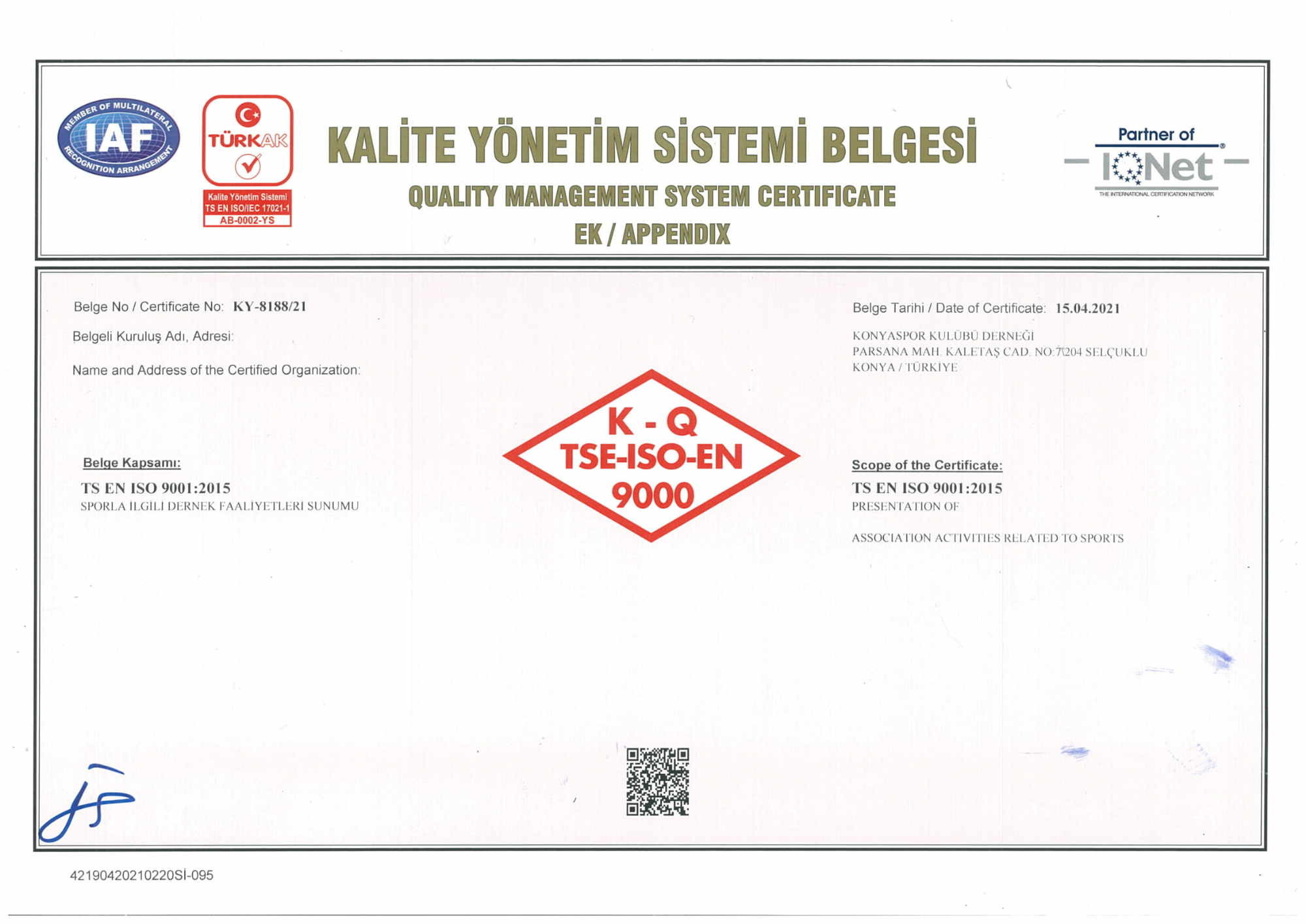 İttifak Holding Konyaspor’umuz, kalite yolculuğunda ilk adımını ISO 9001:2015 Kalite Yönetim Sistemi (KYS) sertifikasını alarak attı. Türk Standartları Enstitüsü tarafından yapılan ve 13 Nisan 2021 tarihindeki son denetimi de başarıyla tamamlayan kulübümüz, ‘TS EN ISO 9001:2015 Kalite Yönetim Sistemi’ belgesi almaya hak kazandı. ‘TS EN ISO 9001:2015 Kalite Yönetim Sistemi’ belgesine sahip olan az sayıda Süper Lig takımlarının arasında artık kulübümüz de bulunuyor. Özel şirketler yerine Türk Standartları Enstitüsü tarafından denetlenmeyi tercih eden kulübümüz, Kalite Yönetim Sistemi Belgesi’nin yanı sıra Güvenli Hizmet Belgesinin de sahibi oldu. Kulübümüze verilen ISO 9001:2015 KYS sertifikası her yıl mutat olarak yapılacak denetimlerin ardından 3 yıl sonra revize edilebilecek.