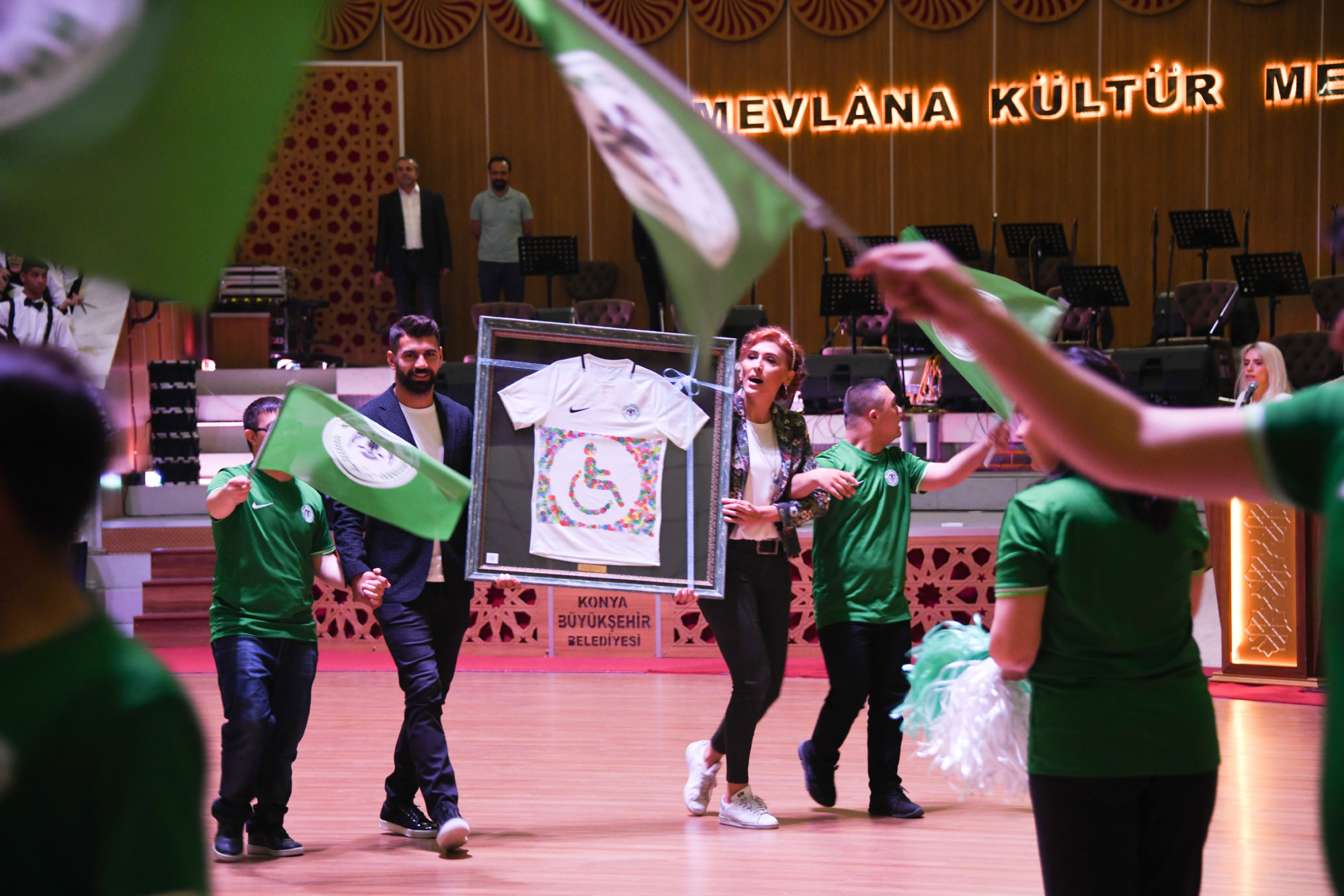 Takım kaptanlarımızdan Selim Ay Konya Valiliği tarafından organize edilen 10-16 Mayıs Engelliler Haftası etkinliklerine katıldı. Mevlana Kültür Merkezi’nde gerçekleşen programda Melike Hatun Özel Eğitim Meslek Okulu öğrencilerinin hazırladığı Konyaspor temalı gösteri katılımcılar tarafından alkışlar eşliğinde izlendi. Takım kaptanlarımızdan Selim Ay’ın da katıldığı programın sonunda özel eğitim gören tüm öğrencilerin parmak baskısıyla hazırlanan Atiker Konyaspor forması, gösteride yer alan çocuklar ve kaptanımız tarafından Konya Valisi Cüneyit Orhan Toprak’a hediye edildi. Öğrencilerin yoğun ilgi gösterdiği futbolcumuz Selim Ay daha sonra gelen istekleri kırmadı ve programı izlemek için gelen çocuklar ve taraftarlarımızla fotoğraf çektirdi.